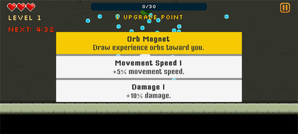 2、获得升级点数后,可在 OrbMagnet(自动吸引以太碎片)、MovementSpeedI(移动速度+5%)和 DamageI(伤害+10%)中选择一项强化。前期推荐优先选择 OrbMagnet,显著提升资源收集效率。