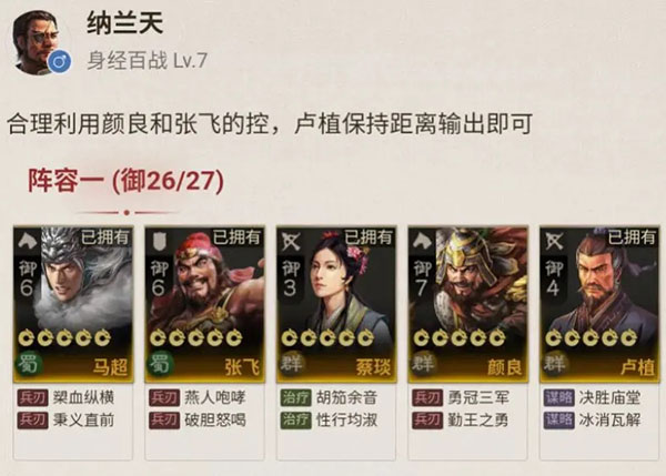 • 蔡琰+颜良 → 刘备+关羽:桃园标配,兼顾开荒与PK。