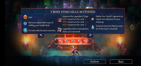 每关结束后可进入传奇铸造所,用于解锁图纸、重铸武器、选择变异、补充血瓶与生命。收藏家处的解锁项目需消耗细胞,效果永久保留,即使死亡也不丢失;而变异仅在当前局生效,死亡即失效,且未完成变异选项无法离开铸造所。