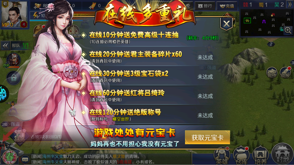 保持在线10分钟领高级十连抽(必得橙色英雄),后续在线奖励逐步解锁红将、称号,记得定时领取。