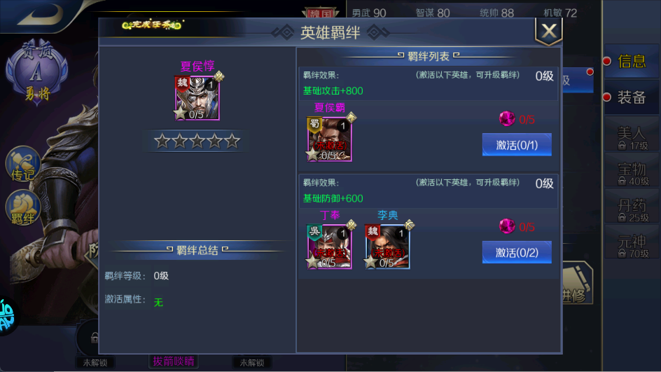 激活角色羁绊【如:夏侯惇与夏侯霸、李典的羁绊】,快速提升基础攻击与防御,增强武将实战能力。