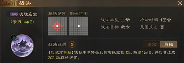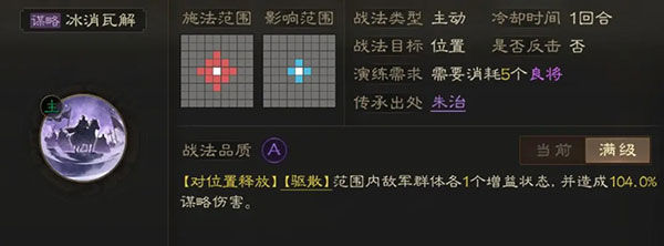 卢植自带战法【决胜庙堂】可显著提升队友输出能力,其自身谋略伤害亦不容小觑。搭配A级战法【冰消瓦解】兼具驱散与伤害,在面对曹仁等高防护武将时,驱散效果收益远超单纯输出。