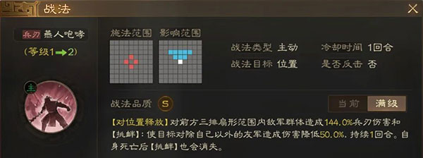 张飞担任队伍主坦,自带战法【燕人咆哮】为主动技,兼具范围伤害与挑衅效果,可有效降低敌军对我方其他单位的威胁,属于软控型技能。搭配战法【破胆怒喝】可造成高额单体伤害,并有50%几率使目标眩晕。