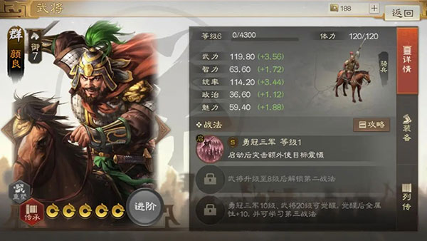 颜良作为第二输出点,自带战法【勇冠三军】为启动技,可赋予自身【先攻】状态,并在下次主动单体攻击后附加额外伤害与【震慑】效果。搭配战法【勤王之勇】进一步提升输出能力。