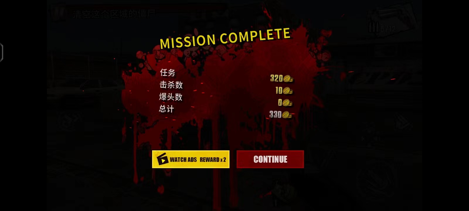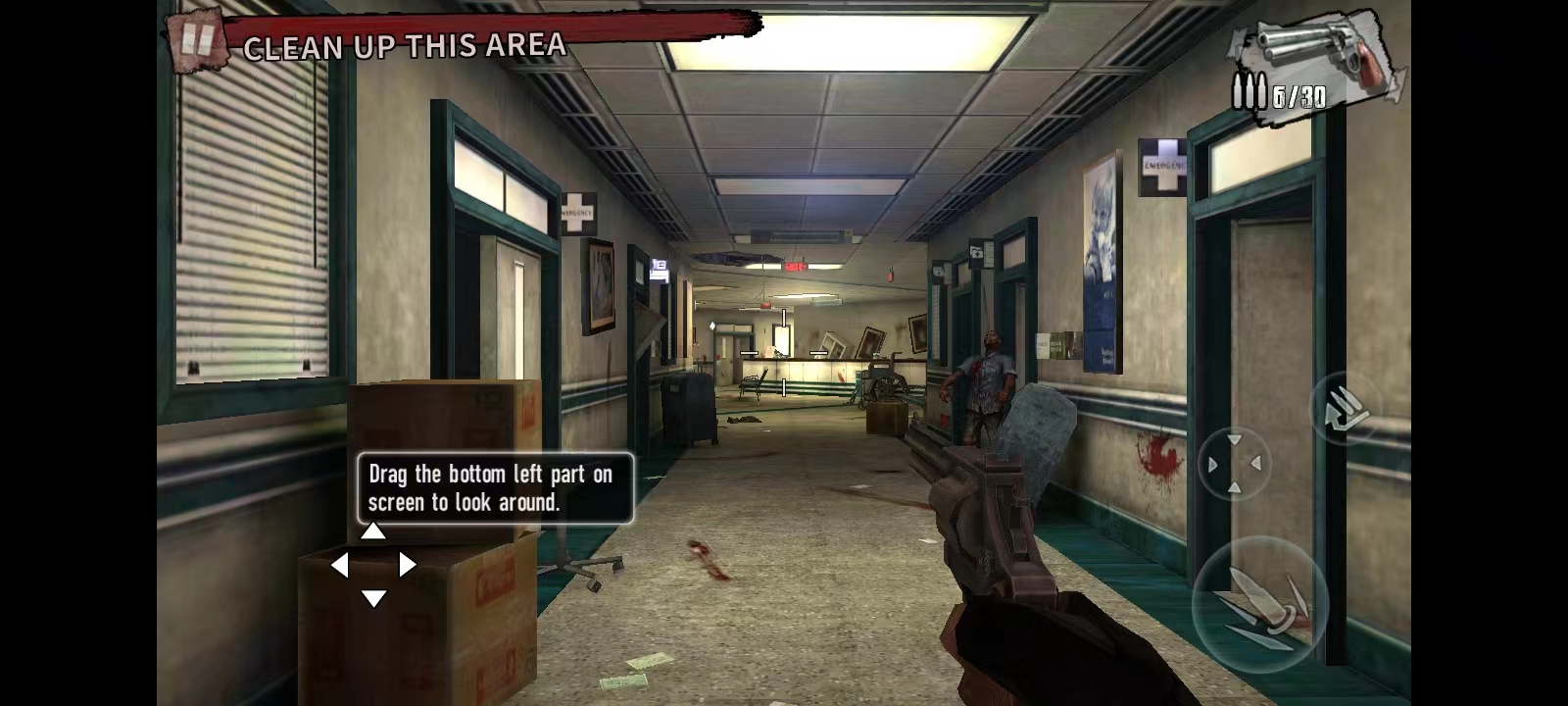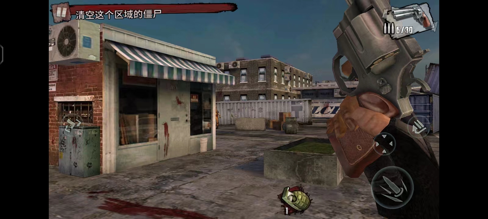 4、游戏开始后,左上角会显示当前任务目标(如清空区域内所有僵尸)。左侧区域控制视角方向,右侧设有射击、瞄准及装弹按钮。当僵尸出现时,滑动左侧屏幕进行瞄准,点击射击即可。注意场景中的油桶,击爆后可对周围僵尸造成范围伤害,有效提升清怪效率;