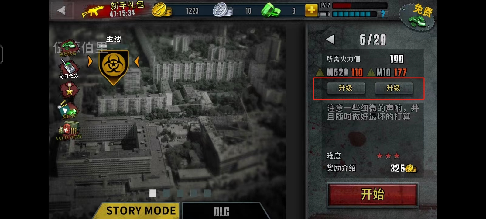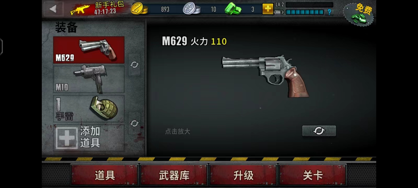 2、点击【开始游戏】,先选择合适的武器,再进入【关卡】界面;