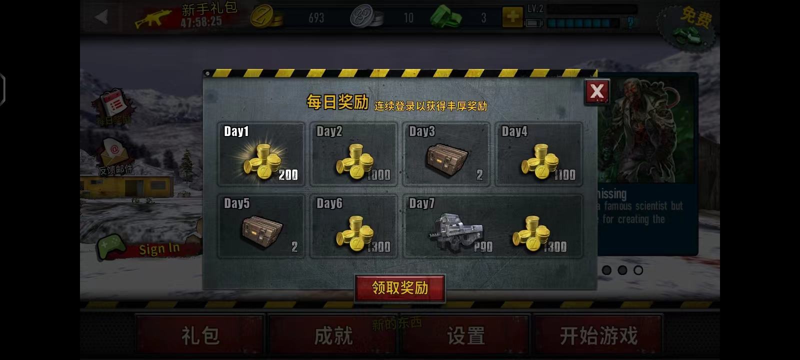 1、进入主界面后,可点击左侧的【每日奖励】领取金币,连续登录还可获得更丰厚的累积奖励;
