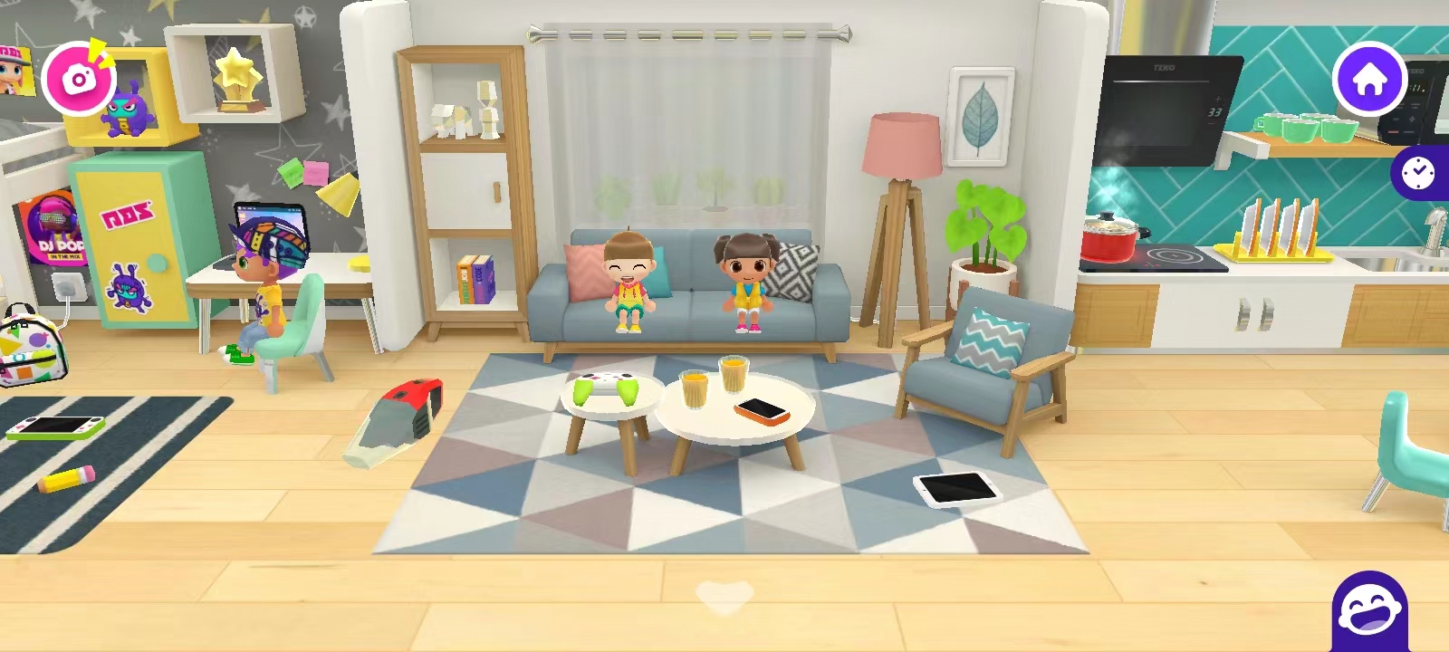 5、点一下身后的大门,可以切换另一个场景;进入场景后,里面是家居生活场景,你可以在这里点击你的卡通人物在这里玩耍,做饭等等,还能左右滑动屏幕;点击下方的透明白色按钮可以回到之前的场景;