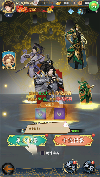 通过点将台招募武将,十连或单次累积召唤,轻松获得传说级英雄,组建你的梦之队。
