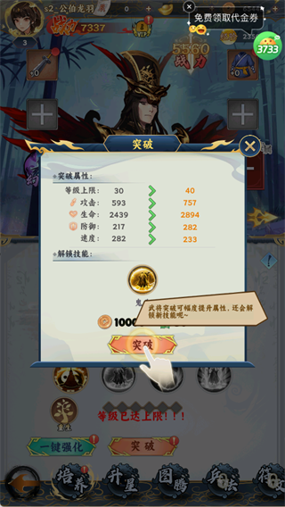 通过突破升级、升星和技能强化,全面提升武将属性与战斗力,同时激活魏蜀吴等阵营羁绊,释放更强合击效果。