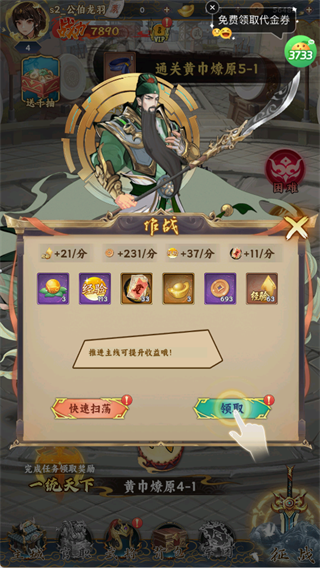 通关主线关卡后即可领取离线收益,粮草、铜币和武将经验持续累积,即使不在线也能稳步成长。