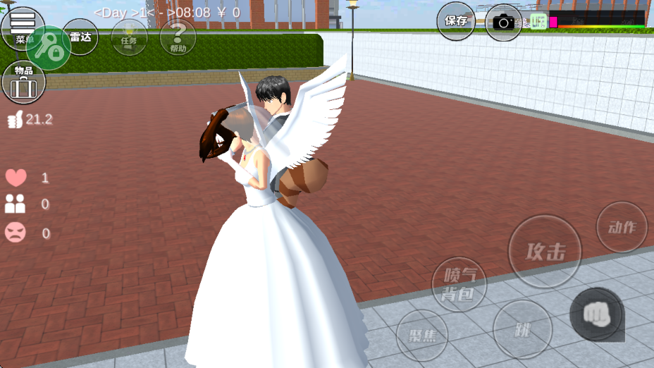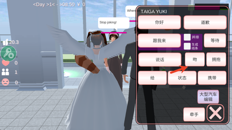 4、打开系统设置,将游戏时间调整至晚上八点,转身面对伴侣,选择“Kiss”(或“亲吻”)动作,即可完成结婚仪式。