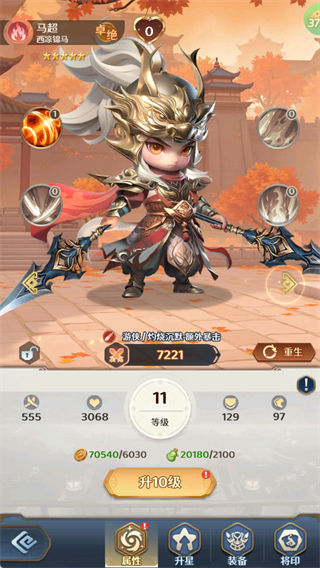 2、马超(游侠/灼烧暴击) 定位:中前排游侠,核心是灼烧持续伤害+暴击爆发。 西凉锦马超,以勇武著称,在游戏中是高机动的输出型武将。
