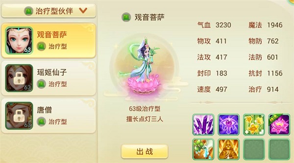 治疗型伙伴方面,唐僧与观音均为优质选择。观音持续治疗能力强、奶量充足;唐僧则擅长瞬间抬血线,保命效果更佳。相比之下,瑶姬仙子无论在治疗强度还是被动技能上均逊色不少,不建议优先使用。