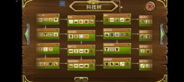 前期可优先跟随右侧科技树指引进行发展。点击科技树即可查看当前可解锁内容及所需资源,按需采集木材、矿石等材料,逐步推进游戏进程。