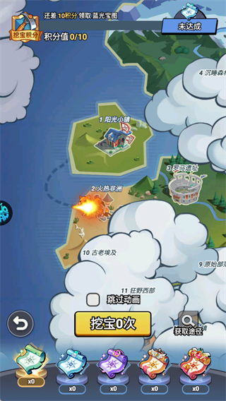 随着关卡的进展可解锁更多地图,包含阳光小镇、火焰非洲等多个区域,可看到当前挖宝积分,通过挖宝获取奖励。