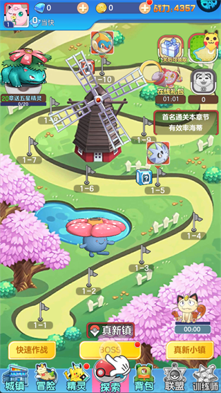在真新镇的冒险地图中,按关卡顺序推进,完成关卡可获得奖励,还有在线礼包等福利可领取。