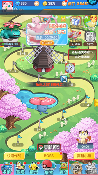 角色达到18级、56级可开启联盟、训练师功能,同时首充可获得神兽梦幻;加入联盟后可参与联盟活动,提升训练师等级解锁更多玩法。