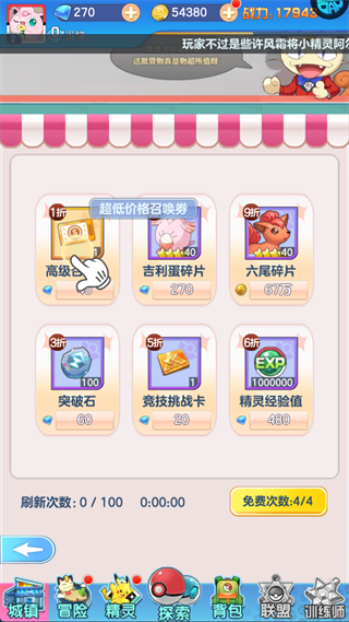 可在商店内购买高级召唤券、吉利蛋碎片、六尾碎片等超低折扣商品,可利用免费次数和钻石购买,快速提升精灵阵容实力。
