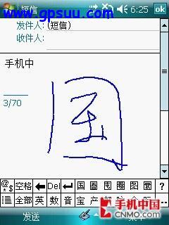 图为:i-mate PDAG手机操作界面 同样的,i-mate PDAG的手写软件也是拥有两种输入方式。其一是具备六个纠正字的全屏手写,缺点是一次只能输入一个字。如果选择另外一种普通手写,那么范围就被缩小到下边的三个方格,但却可以不等系统识别就立刻进行下个字的输入工作。至于以上方式及虚拟键盘您更习惯哪种,就是仁者见仁的事情了。
