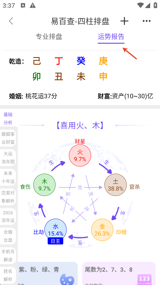 4、点击界面右侧“运势报告”,即可查看涵盖流年大运、月运、日运等维度的详细分析解读。