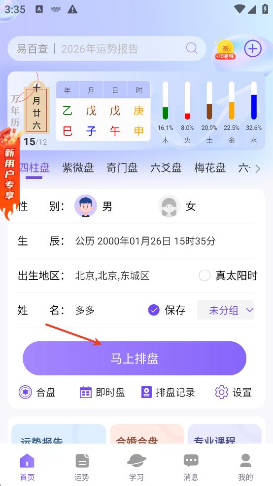 2、按提示输入出生时间、地点等必要信息,确认无误后点击“马上排盘”。