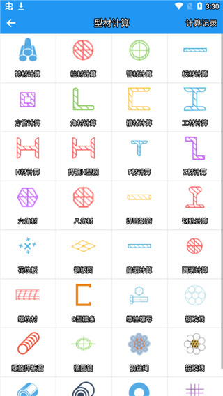 2、点击“型材计算”,进入细分计算场景,包含方管、圆管、角钢、槽钢、H型钢等多种类型。以“特材计算”为例,用户可按实际工况选择对应参数模板。