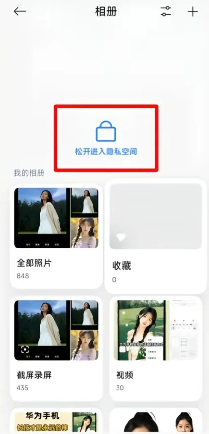 方法一:在相册主界面持续下拉屏幕,直至出现锁形图标或“进入隐私空间”提示。