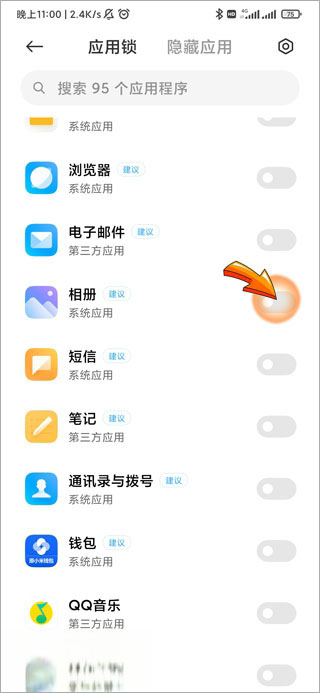 3、在应用列表中找到“相册”,点击右侧开关启用锁定功能,后续每次打开相册均需验证身份。