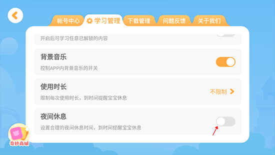 3、在设置菜单中选择“学习管理”,向下滑动至页面底部,点击“夜间休息时间”右侧的开关按钮即可开启功能。
