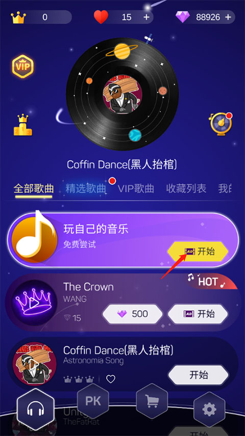 1、进入游戏主界面,选择“玩自己的音乐”选项并点击开始