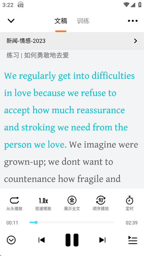 2、进入播放页面后,下方工具栏支持从头播放、倍速调节、全文/单词切换、顺序播放及定时关闭等功能;