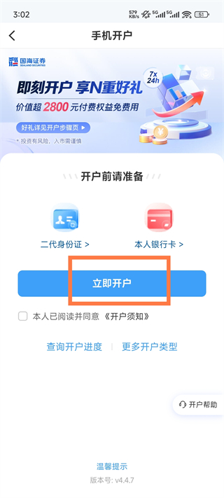 2、点击“立即开户”(开户前请准备好本人二代身份证及绑定银行卡)。