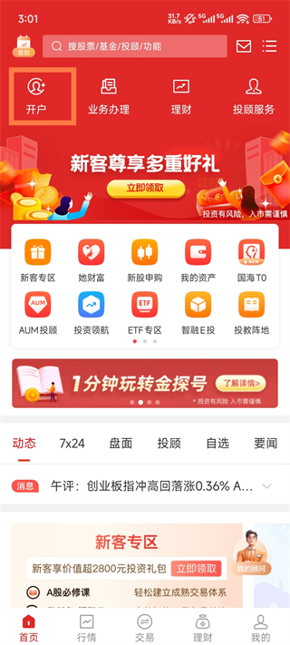 1、首次使用国海金探号APP需先完成开户流程,请点击首页“开户”按钮。