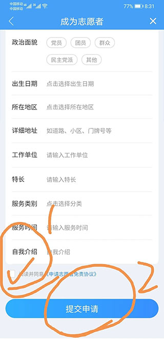 8、系统将跳转至志愿者注册页面,请按要求填写个人信息,勾选同意相关协议后提交申请。