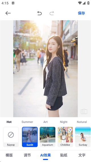4、在AI效果模块中,还可对光影进行智能美化,自由选择时间段(如清晨、黄昏)及风景风格(如森林、海滩),让照片氛围感十足。