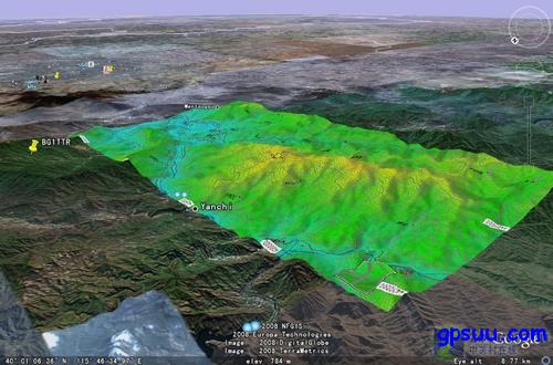 经过前面的制作,现在我们利用GoogleEarth独特的显示视角来查看这一地区的等高线地图,如下图所示:
