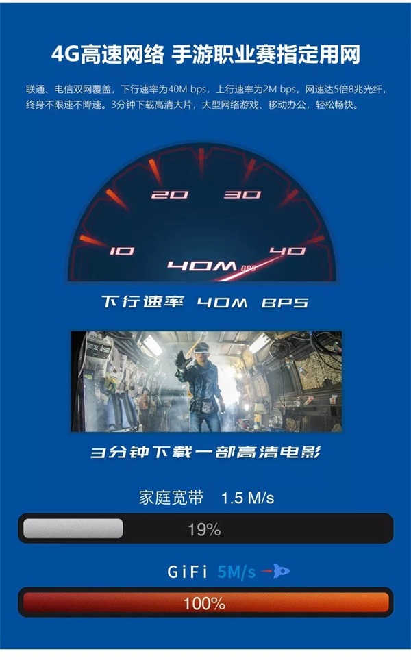GiFi 4G高速网络 ,下行速率高达40M bps,网速高达5倍8兆光纤
