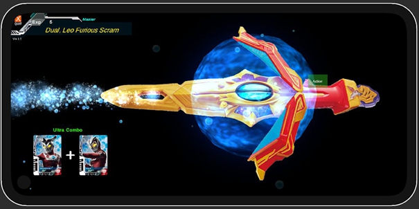刷卡读取特利迦空中型的奥特次元卡牌之后,剑身上聚集大量的兰帕尔特能量,以自身为轴心高速旋转并对敌人进行猛烈的连环斩击!