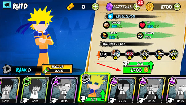 2、在角色列表中可查看每位忍者的详细属性,点击对应角色即可进行升级操作;