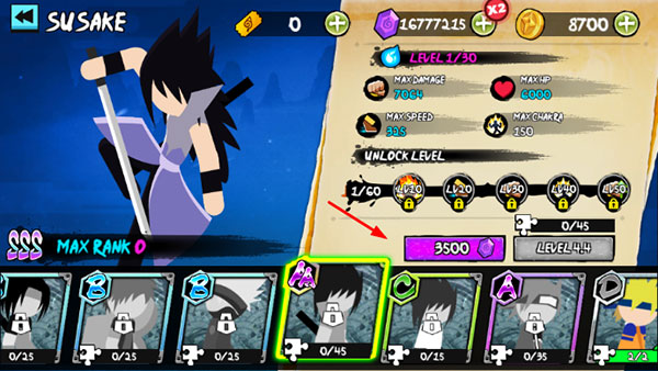 1、合理搭配武器与技能,击败所有拦路敌人,通过升级忍者不断提升战斗力。