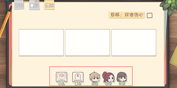 1、进入游戏后,屏幕下方会显示本关可用的各类元素,包括人物、道具和场景。