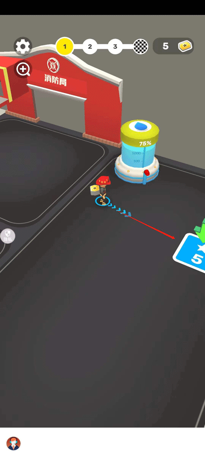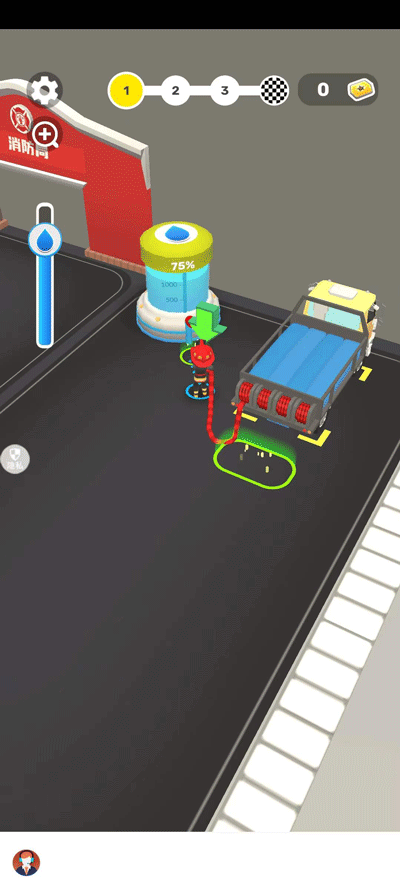 3、继续向右行进,到达指定绿色箭头区域后,系统将自动弹出消防车。此时请按照屏幕提示,将水管正确连接至消防车接口。