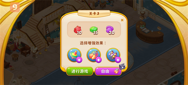 钥匙是游戏中的关键资源,可通过完成消除关卡获得,每次进入关卡前,玩家可选择是否使用增强效果,或切换至“自由模式”体验更轻松的玩法。