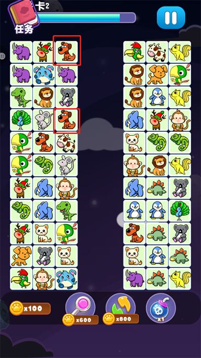 进入传统模式后,玩法非常直观:将两个相同的动物图案用线连接即可消除,例如两只相同的小狗。但连线过程中拐弯不能超过两次,否则无法成功消除。