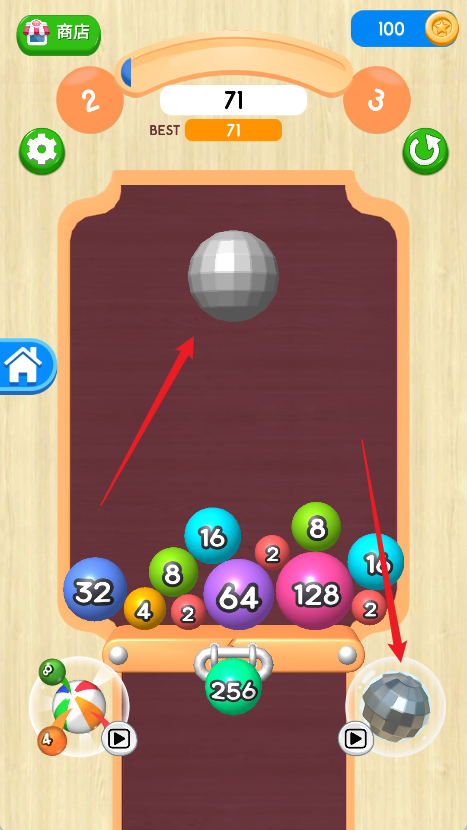 5、右下角的金属冲击球具备扰动功能,可打乱已堆叠球球的位置,帮助玩家重新排列布局,创造新的合并机会;