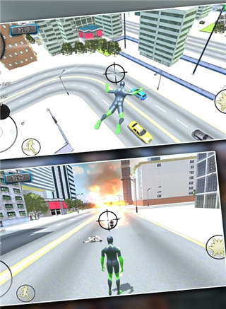 4、右下方设有爆炸攻击键,瞄准建筑物可实现飞檐走壁,锁定敌人则发动强力打击。