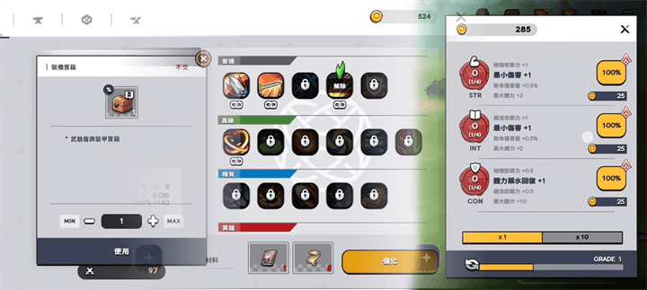 ① 属性:通过持续战斗获取金币,用于提升基础属性,如伤害输出、药水回复效率等。