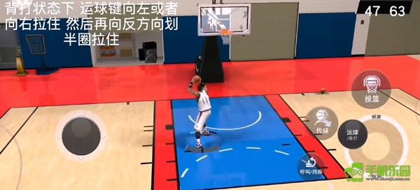5、梦幻舞步:在背身单打状态下,先将运球键向左或向右拉住,再迅速向反方向划出半圆并持续按住。