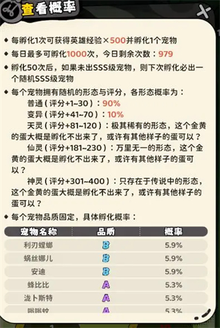 4、孵化机(抽卡)只能抽到普通和变异两种形态的宠物,前期可以适当抽取变异SSS宠物,资质最高。后期只需要用获取的免费抽卡券抽即可。